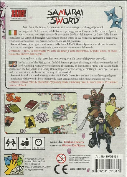 Samurai Sword es un juego basado en la probada mecánica de Bang! y ambientado en el Japón feudal. En este juego, las características habituales de Bang! se ven reforzadas por una jugabilidad más dinámica y rápida, y gracias a un nuevo sistema de puntuación basado en puntos de honor y de resiliencia, no hay eliminación de jugadores. ¡Todos luchan hasta el final! Además, las armas y los ataques se fusionan en una sola carta.