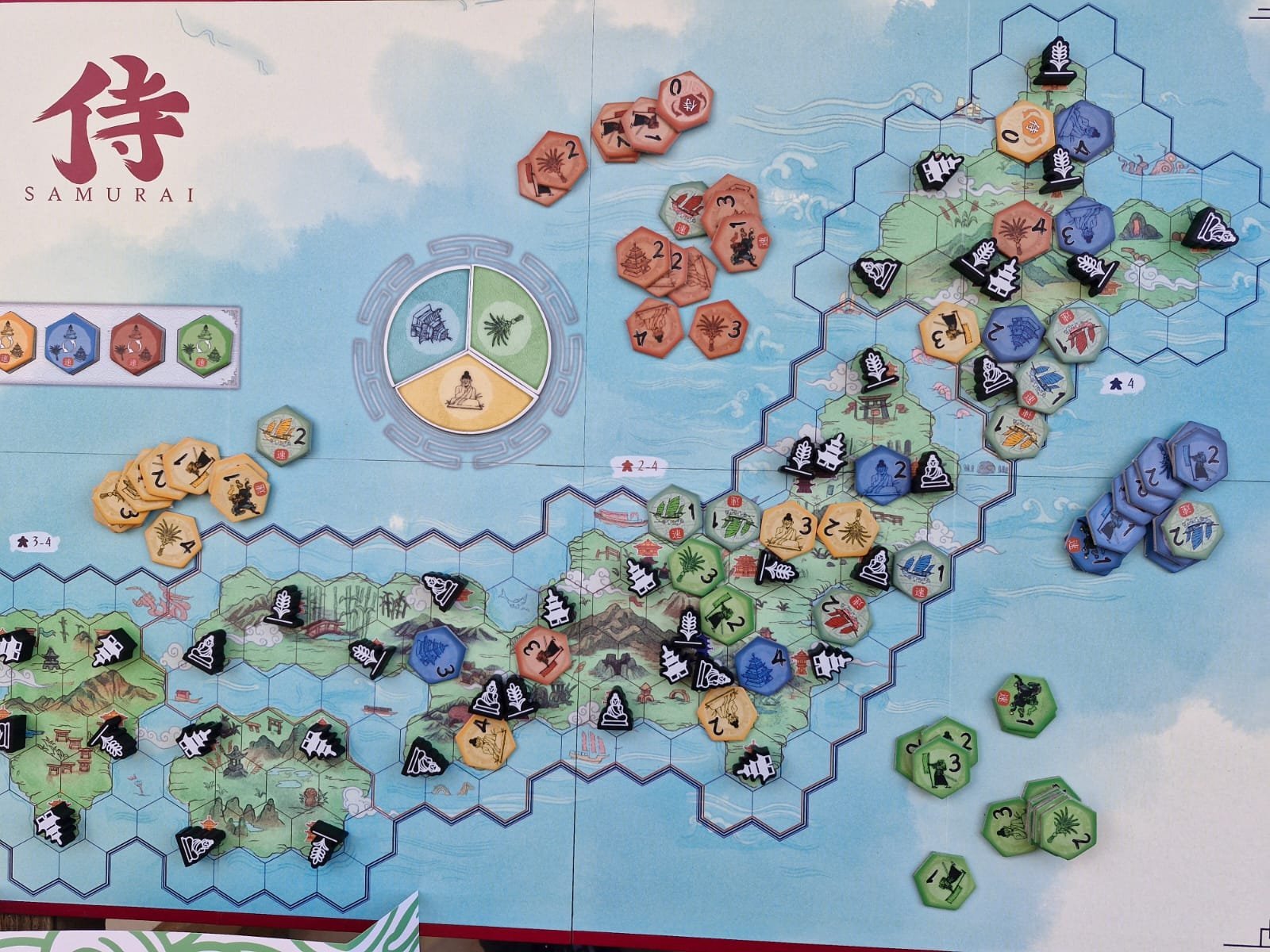 Samurai es un juego ambientado en el Japón medieval donde los jugadores compiten por el favor de tres facciones: samuráis, campesinos y sacerdotes, representadas por Armerías, arrozales y Budas en el tablero que muestra las islas de Japón. Utilizando fichas hexagonales, los jugadores rodean y capturan estas figuras para ganar influencia.