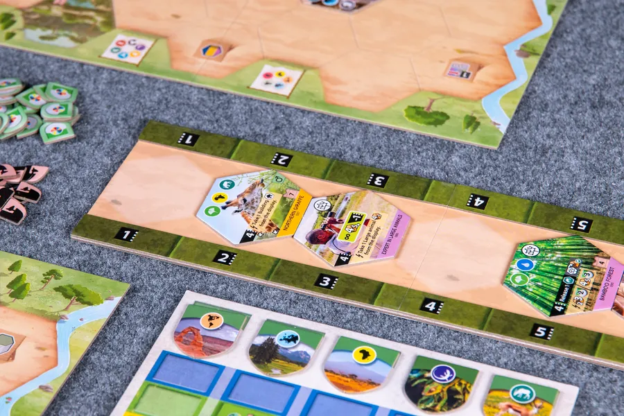 Cada jugador tiene un conjunto de cuatro cartas de acción para gestionar su juego, y el poder de cada acción se determina por la ranura que ocupa. Una de estas cartas te permitirá jugar proyectos, y las otras tres te permitirán jugar animales de un hábitat específico: bosque, roca o agua.