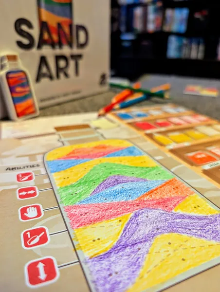 Sand Art es una propuesta única en el estilo de juegos «___ y escribe». Durante el juego, te mueves de un lado a otro a lo largo de un recorrido lineal de acciones en la mesa de trabajo, reuniendo arena de diferentes colores, mezclando arena de colores primarios con nuevos colores secundarios y vertiéndola en botellas para crear patrones e imágenes que atraerán a los clientes de tu tienda. Crear las botellas más originales y visualmente atractivas te hará ganar más puntos.