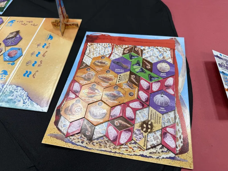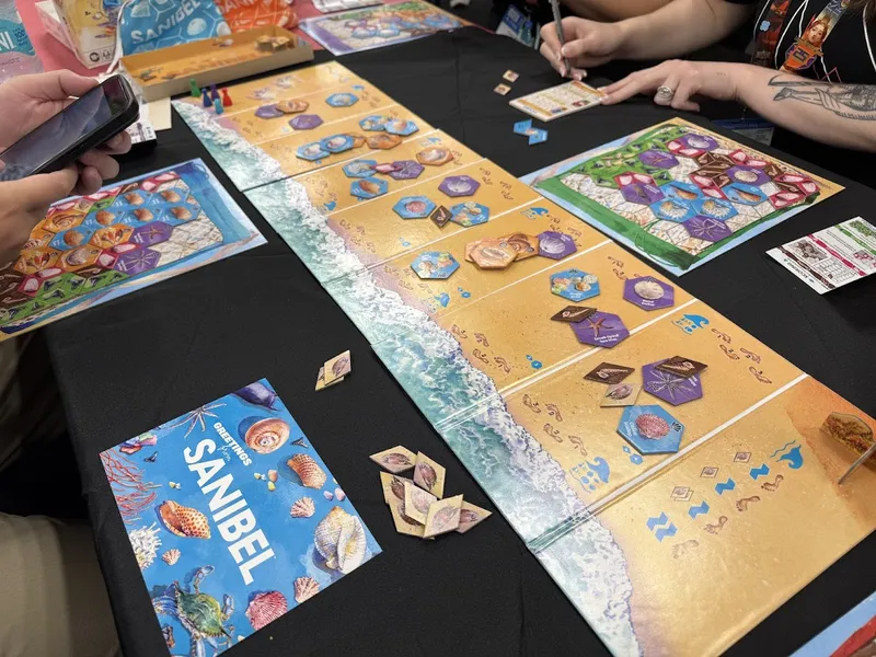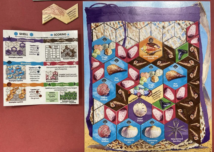 En Sanibel, los jugadores recorren las playas de esta ciudad isleña de Florida, recolectando una gran variedad de conchas y metiéndolas cuidadosamente en sus bolsas, donde cada una es su tablero personal. A medida que recogen conchas, las van dejando caer en la bolsa, como en el Tetris. Fíjense en los tipos de conchas y dónde caen, ya que otorgan puntos de diversas maneras. No olviden recolectar también dientes de tiburón, ya que son pequeños y caben en espacios reducidos.