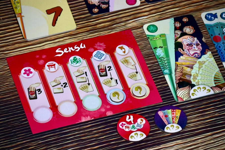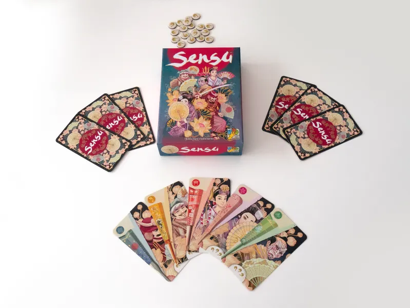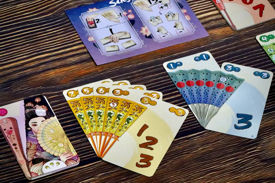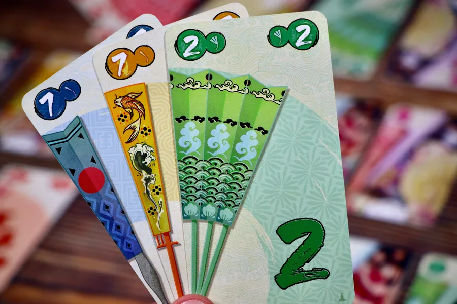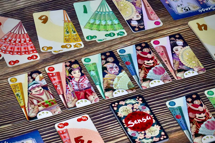 En el juego de cartas Sensu, los jugadores coleccionan abanicos japoneses plegables, intentando reunir cartas de abanico con un valor exacto de 15 en su mano.