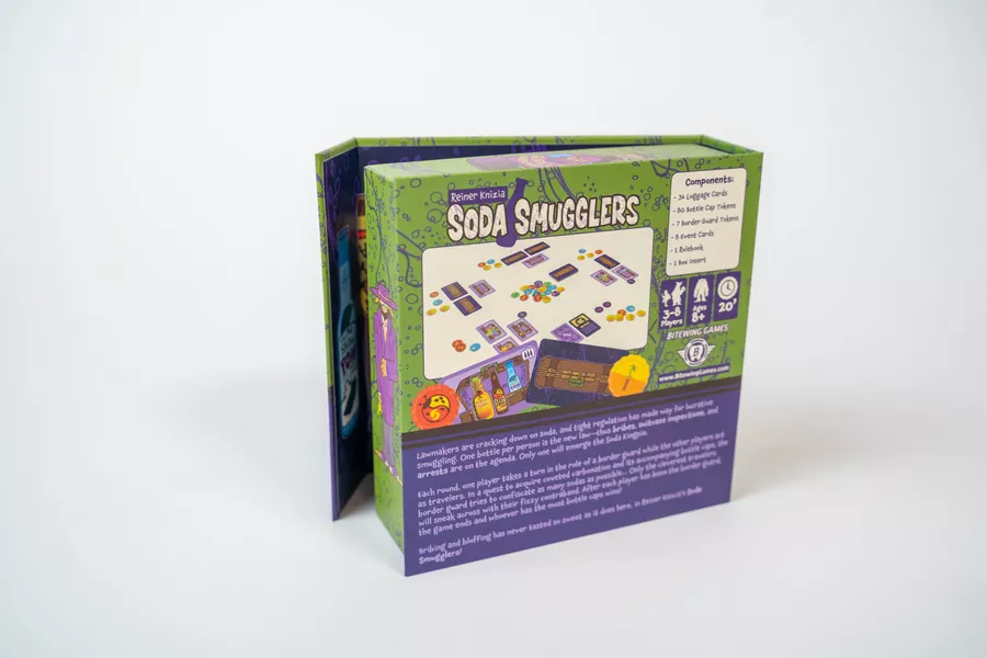 En cada ronda de Contrabandistas de Sodas, un jugador asume el rol de guardia fronterizo, mientras que los demás actúan como viajeros. En su afán por conseguir la codiciada gaseosa y sus correspondientes chapas, el guardia fronterizo intenta confiscar la mayor cantidad posible de refrescos, mientras que solo los viajeros más astutos cruzarán a escondidas con su contrabando de gas. Después de que cada jugador haya sido guardia fronterizo (dos veces en una partida de 3-4 jugadores, una vez en una de 5-8 jugadores), ¡la partida termina y quien tenga más chapas gana!
