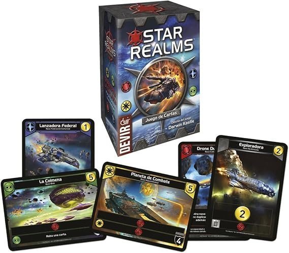 Forja tu propio reino estelar. ¡Construye tu armada por medio del comercio estelar, para luego emplear tus poderosas flotas y naves espaciales para proteger lo tuyo y apoderarte de lo que no lo es! Star Realms combina la diversión de los juegos de construcción de mazos con la interactividad de los juegos de combate con cartas coleccionables. A medida que juegas, usarás el comercio para sumar nuevas naves y bases a tu mazo. Una vez puestas en juego, esas naves y bases generan poderosos efectos, comercio adicional y fuerza de combate con la que atacar al contrario y sus bases.