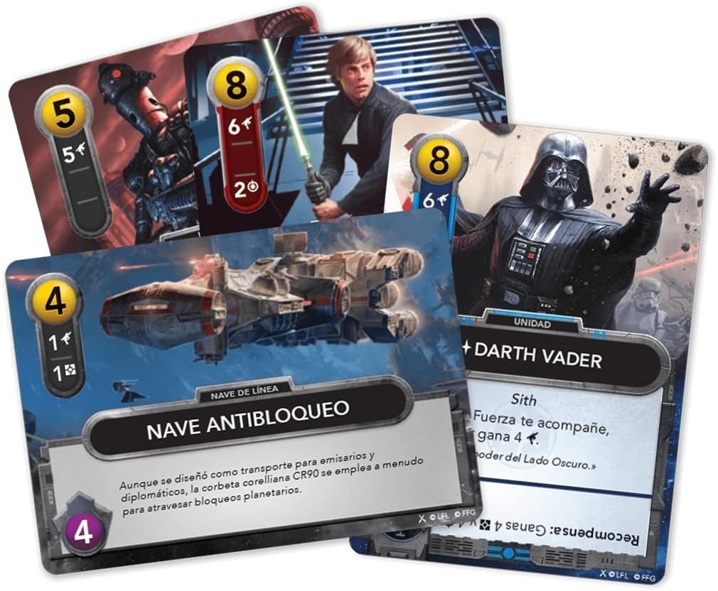 10 cartas de inicio Imperiales, 10 cartas de inicio Rebeldes, 90 cartas de galaxia, 10 cartas de piloto del Borde Exterior, 20 cartas de base, 1 medidor de Equilibrio de la Fuerza, 50 contadores de daño, 20 contadores de recursos, 1 indicador de la Fuerza.