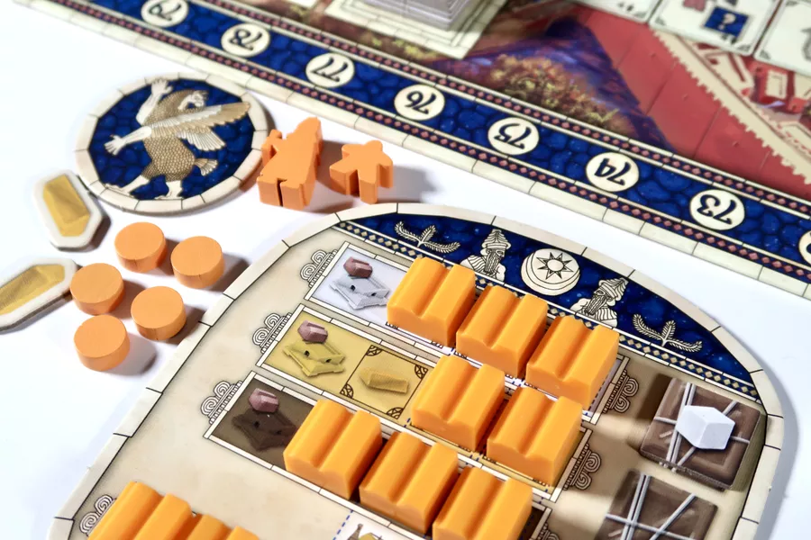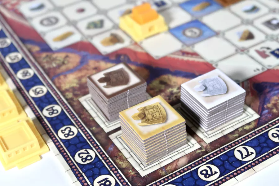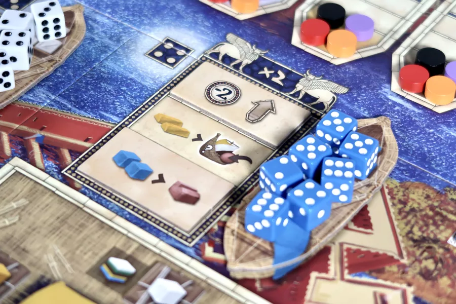 El juego cuenta con 2 tableros de juego de doble cara para adaptarse a las diferencias entre los recuentos de jugadores. El tablero en sí presenta 5 regiones, cada una vinculada a un dado de color específico. Hay 3 distritos de construcción, 1 distrito de templos y 1 distrito portuario.