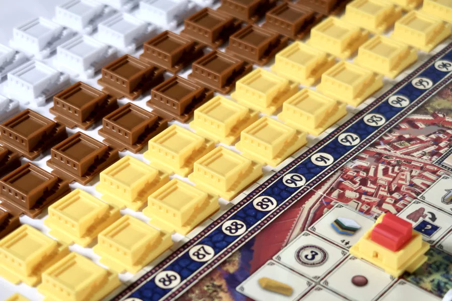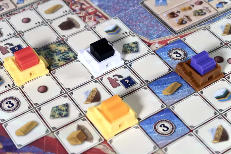 A través de diversas acciones podrás expandir tu influencia en los distintos distritos, expandiendo los sitios de construcción y convirtiéndolos en edificios para sumar valiosos puntos de victoria. Pero también ejercerás tu influencia en el distrito del templo para ganarte el favor del rey. En el distrito portuario puedes obtener barcos con habilidades importantes y para sumar puntos de victoria.