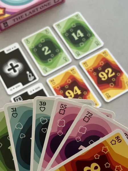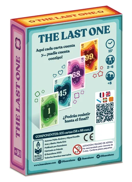 “The Last One” consiste en una baraja con cartas numeradas del uno al noventa y nueve, más seis cartas que forman la zona de juego. Jugarás tus cartas de número en dos filas: en la fila “más” colocarás cartas en orden ascendente y en la fila “menos” en orden descendente. Además, podrás activar efectos que te permitirán robar cartas, a tus rivales o del mazo.
