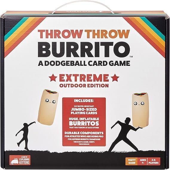 Ya conoces Throw Throw Burrito... ¡Pues ahora prepárate para su versión más extrema! El mismo ritmo frenético y la misma diversión, solo que ahora todos los componentes son mucho más grandes empezando, como no, por dos adorables burritos hinchables con los que protagonizarás los duelos más intensos.