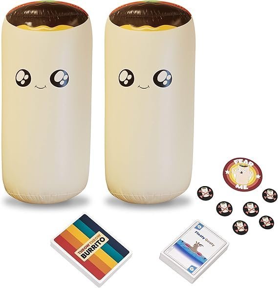 Ya conoces Throw Throw Burrito… ¡Pues ahora prepárate para su versión más extrema! El mismo ritmo frenético y la misma diversión, solo que ahora todos los componentes son mucho más grandes empezando, como no, por dos adorables burritos hinchables con los que protagonizarás las batallas más encarnizadas y los duelos más intensos con tus amigos en el parque, la playa, el campo… ¡O donde se te ocurra siempre y cuando haya espacio para perseguiros unos a otros con un burrito gigante entre las manos!