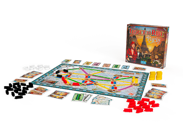 Ticket To Ride: Paris, parte de la línea “Cities” de juegos Ticket to Ride, tiene una jugabilidad similar al juego original, pero con un tiempo de juego de solo quince minutos. En un turno, puedes recolectar tarjetas de transporte, gastarlas para reclamar una ruta en el tablero de juego o robar boletos que muestran dos ubicaciones con las que necesitas conectarte.