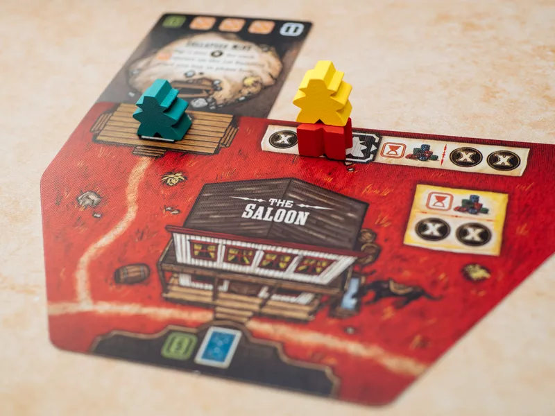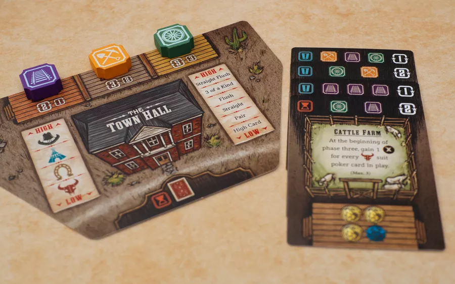 Lo que hace a Tiny Epic Western verdaderamente único es su combinación de colocación de trabajadores y la mecánica del póquer. Cada jugador recibe una carta propia que utiliza las dos cartas adyacentes en la ubicación seleccionada para formar una mano de tres cartas. Esto genera una dinámica de juego profunda y estratégica donde la suerte y el cálculo se combinan para determinar el futuro de los jugadores.