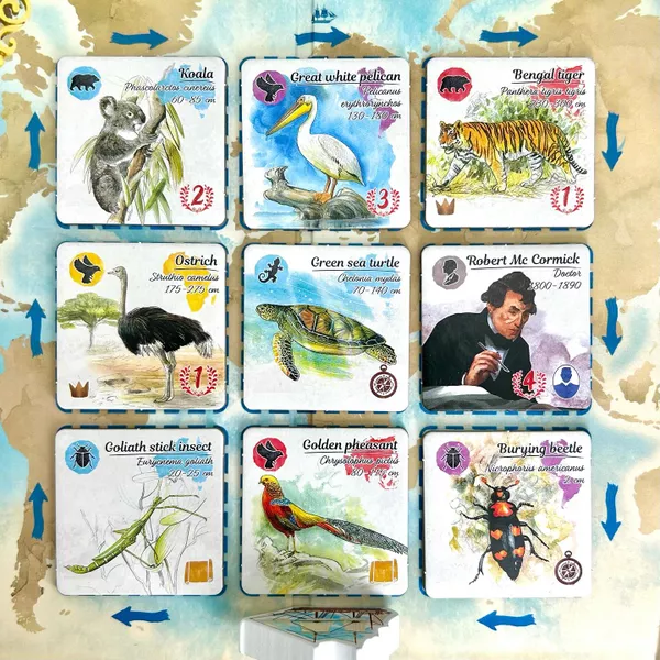 Elige una de las tres losetas frente al Beagle y colócala en tu cuaderno de naturalista. Puede ser un animal para analizar o un personaje histórico que te inspire en tu viaje. Además, recibirás bonificaciones y puntos adicionales según la posición de la loseta.