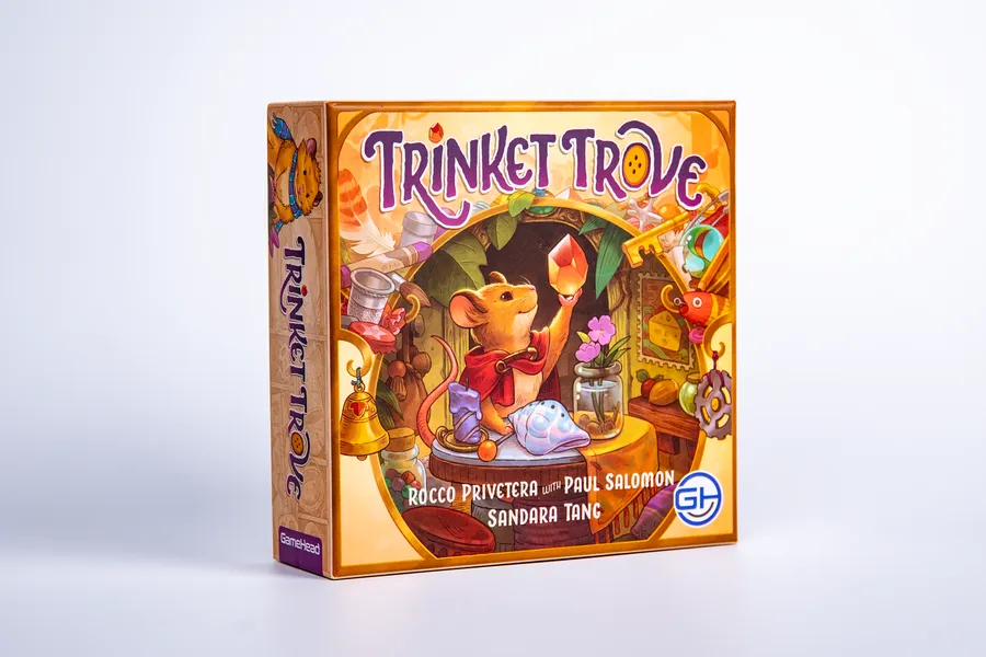 En el juego Trinket Trove, eres un coleccionista: una adorable criatura que vive al margen del mundo humano. Intercambias y coleccionas conjuntos de objetos para decorar tu madriguera. Comienzas con una mano de 4 cartas de objetos, y en cada ronda se reparten nuevas cartas boca arriba en el centro de la mesa. Tú y los demás jugadores se turnarán para pujar por el orden de selección, ofreciendo cartas de objetos de vuestra mano. Luego, los jugadores se turnarán para reclamar los objetos de la mesa, incluidas las cartas ofrecidas por los demás jugadores, y colocarlas en su mano. Al final de 5 o 6 rondas, se puntúan las cartas de objetos de cada jugador y ¡el jugador con más puntos gana!
