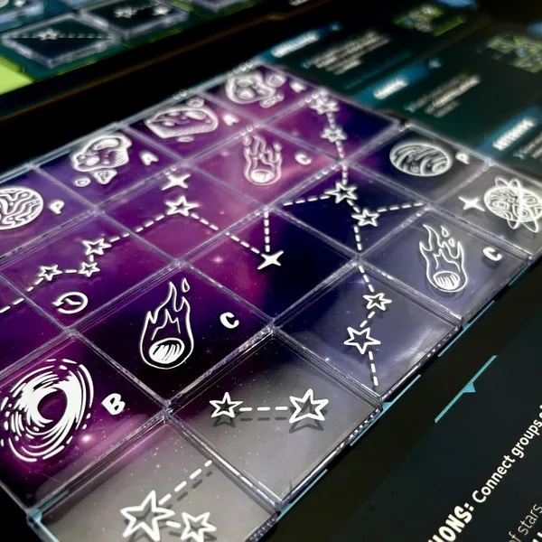 En el juego de colocación de fichas Twinkle Twinkle, llenarás tu mapa estelar con fichas de plástico transparente, intentando conectar constelaciones, construir cinturones de asteroides, recolectar cometas, recoger planetas y estudiarlos con satélites. ¡Cuidado con esos molestos agujeros negros! (A menos que tengas el lugar perfecto para ellos, claro).