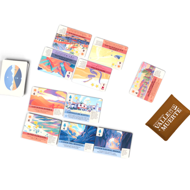 El Valle de la Muerte es un juego para 2 jugadores de Kevin Ellenburg donde los jugadores asumen el rol de unos aventureros que tienen que documentar un peligroso viaje por este maravilloso enclave. Con mecánicas de forzar la suerte y construcción de tablero, en cada turno deberás asignar una carta a tu viaje o a tu álbum de recortes teniendo en cuenta los efectos de cada carta y evitando morir en el intento.