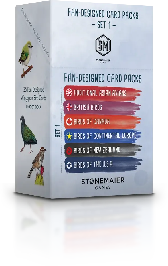 Esta caja contiene 150 aves nuevas para Wingspan, divididas en 6 paquetes regionales de 25 aves cada uno. Incluye ilustraciones, mecánicas de juego y aves nunca antes vistas en Wingspan ni en sus expansiones.
