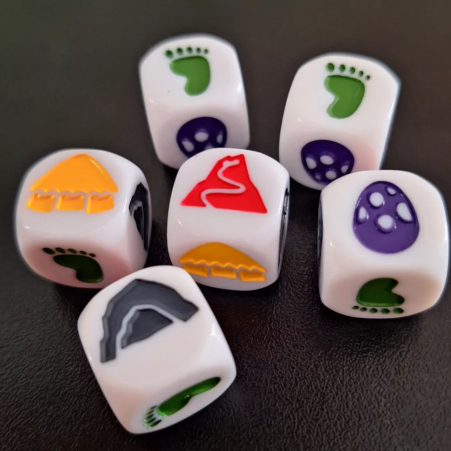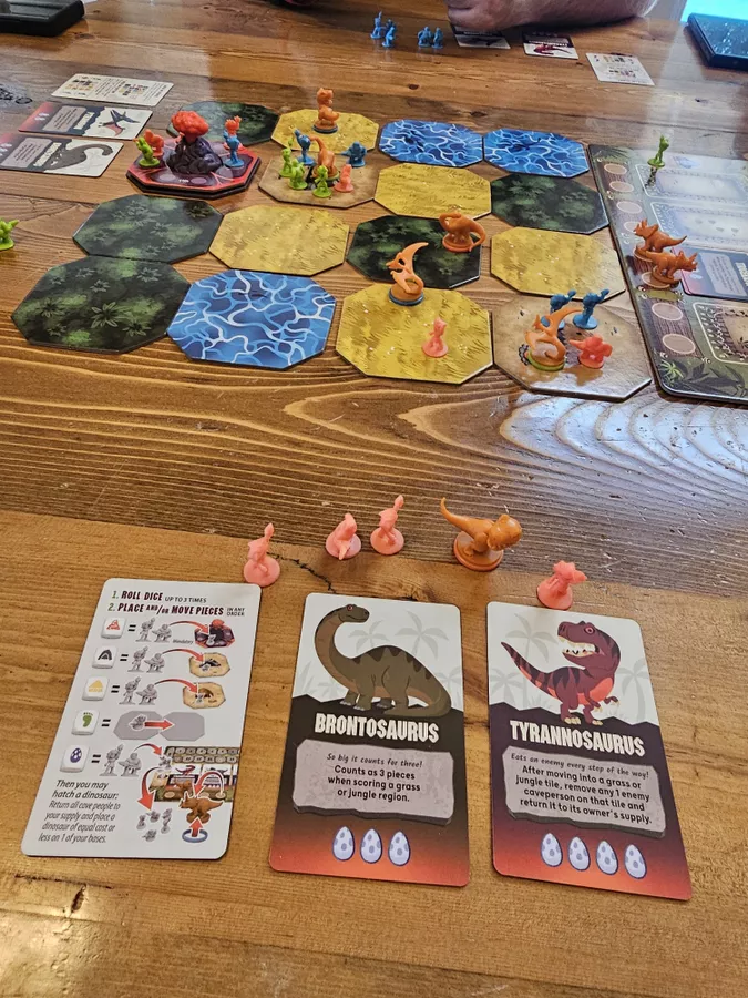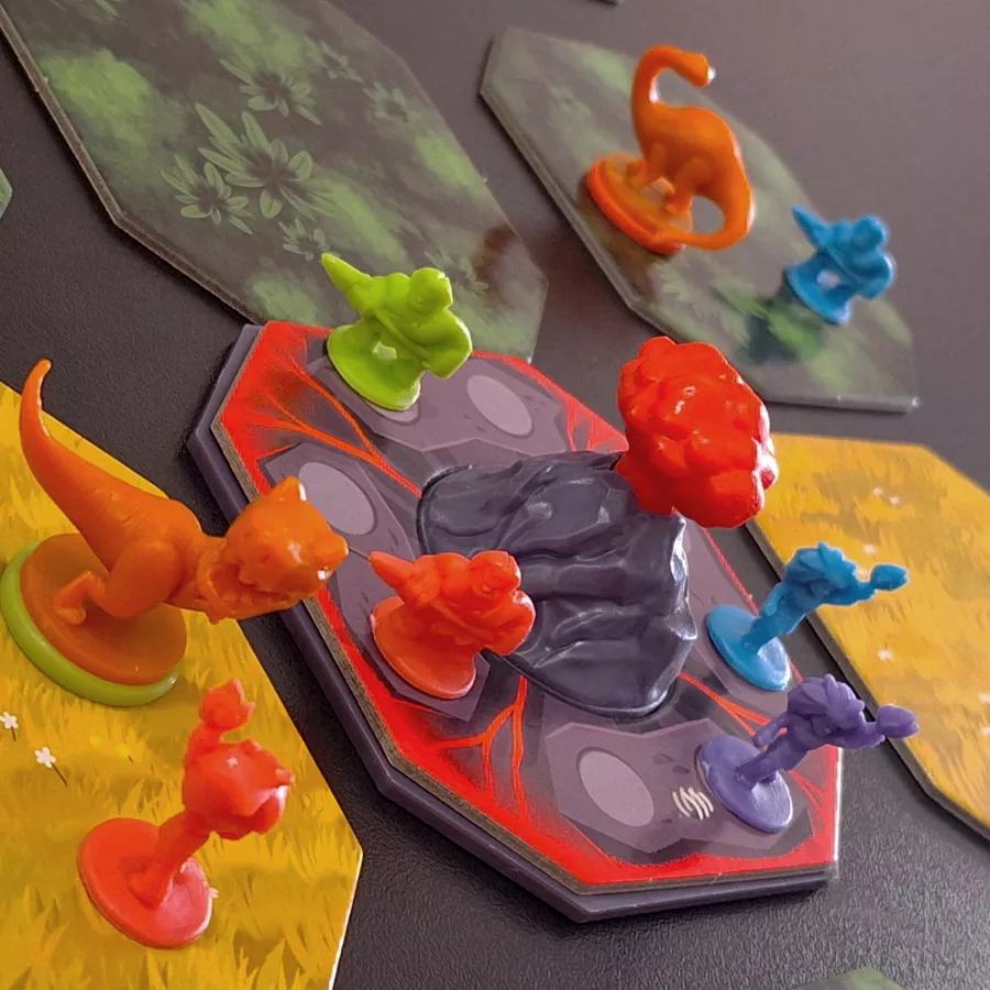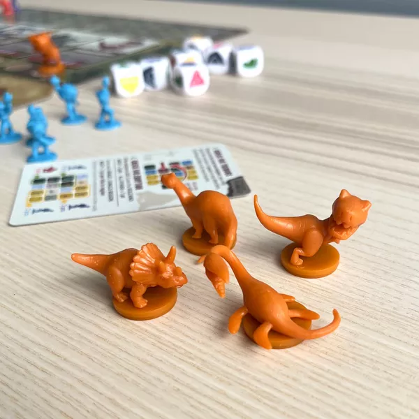 Si tienes suficientes habitantes de las cavernas en la región de eclosión de dinosaurios, puedes tomar uno de los dinosaurios de esta área y agregarlo a tu suministro, colocarlo en una cueva o cabaña y luego moverlo entre las fichas como una persona. Cada dinosaurio tiene un poder especial, como permitirte tirar un dado extra, ocupar espacios de agua o volar a cualquier casilla.