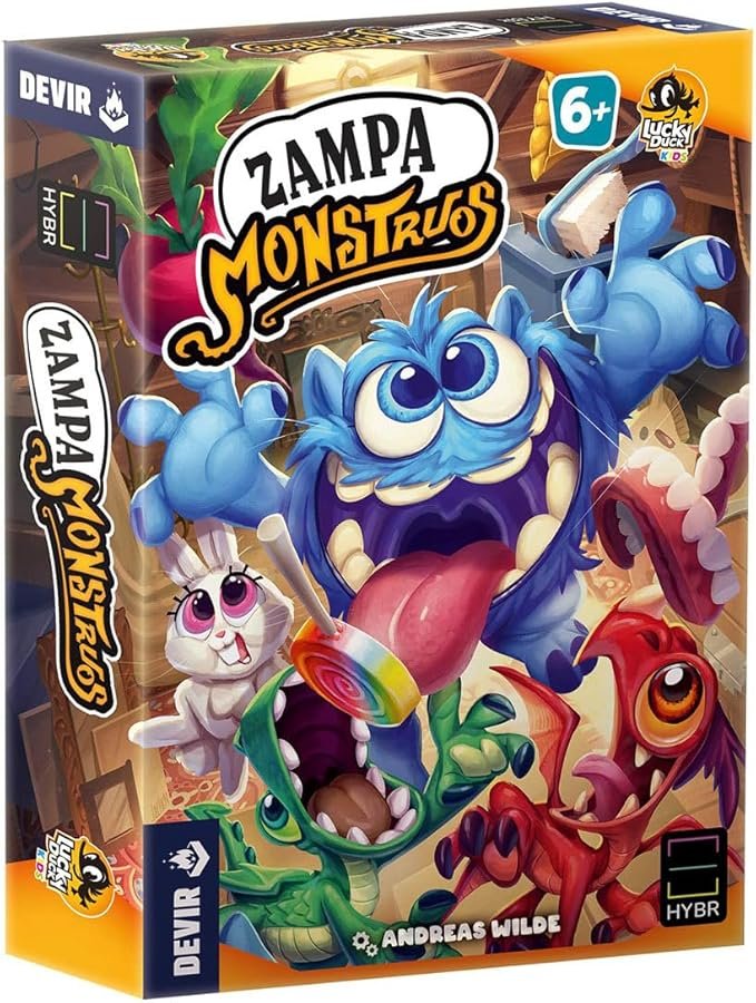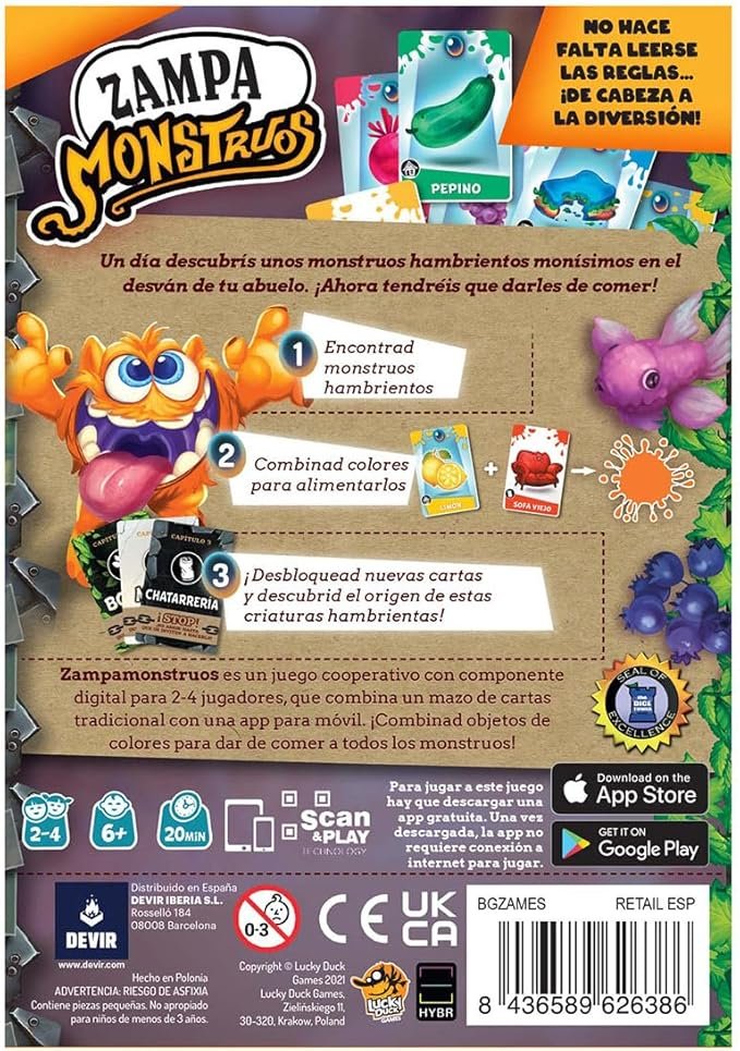 Zampa Monstruos es un juego de cartas cooperativo de combinación de colores para 2 a 4 jugadores, a partir de 6 años. El objetivo es completar cada uno de los niveles alimentando a todas las criaturas con la comida que más les gusta.